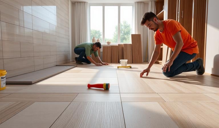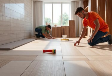 Pose soignée de carrelage, parquet, stratifié et sols techniques, avec des finitions durables et parfaitement alignées.